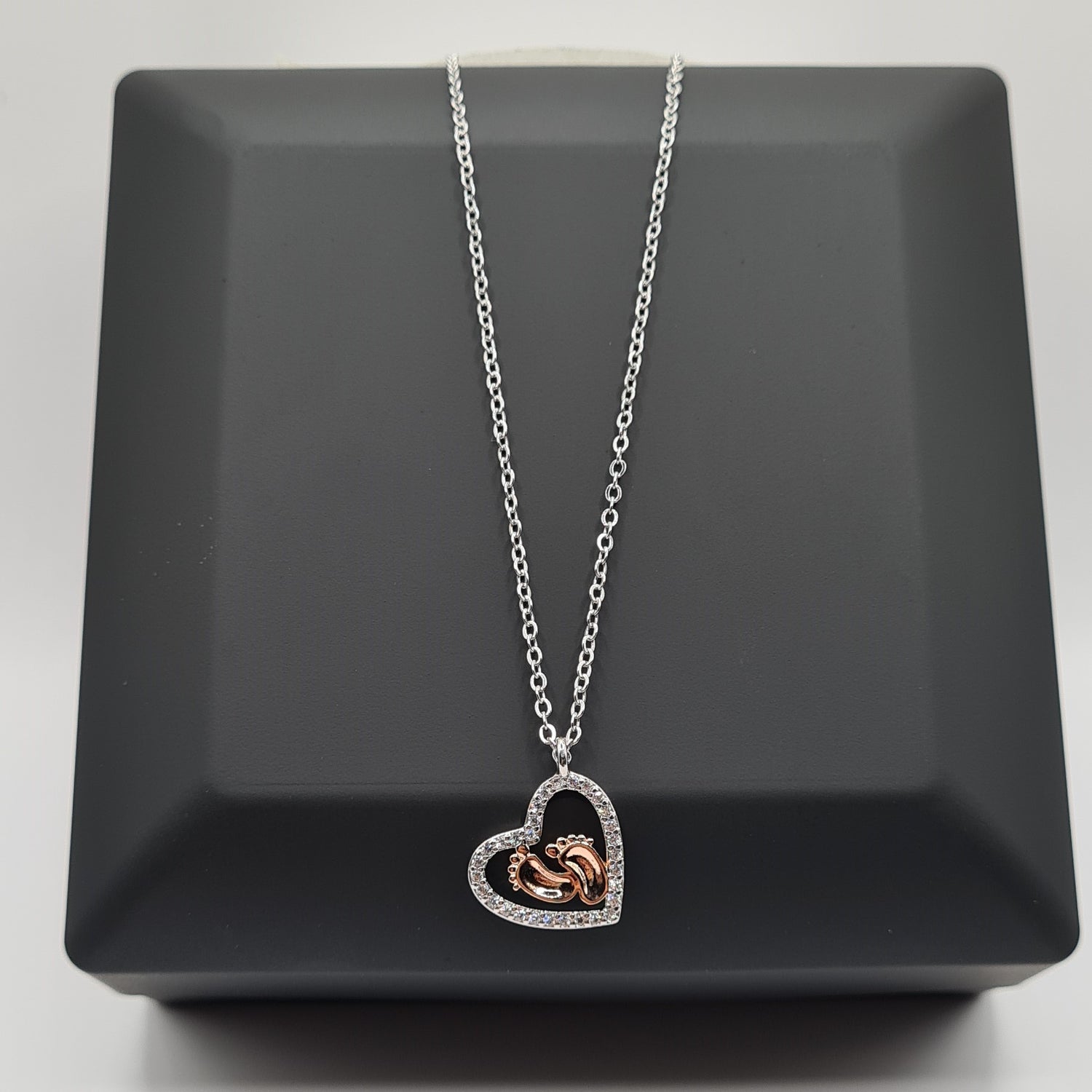 Babyvoetjes 🦶 van roségoud, smaakvol geplaatst in een omgeving van sprankelende zirkonia, vormen de blikvanger van deze ketting. 👀 Het resultaat is een stuk dat zowel chic als betekenisvol is, een blijvende herinnering aan deze speciale tijd. 🕰️